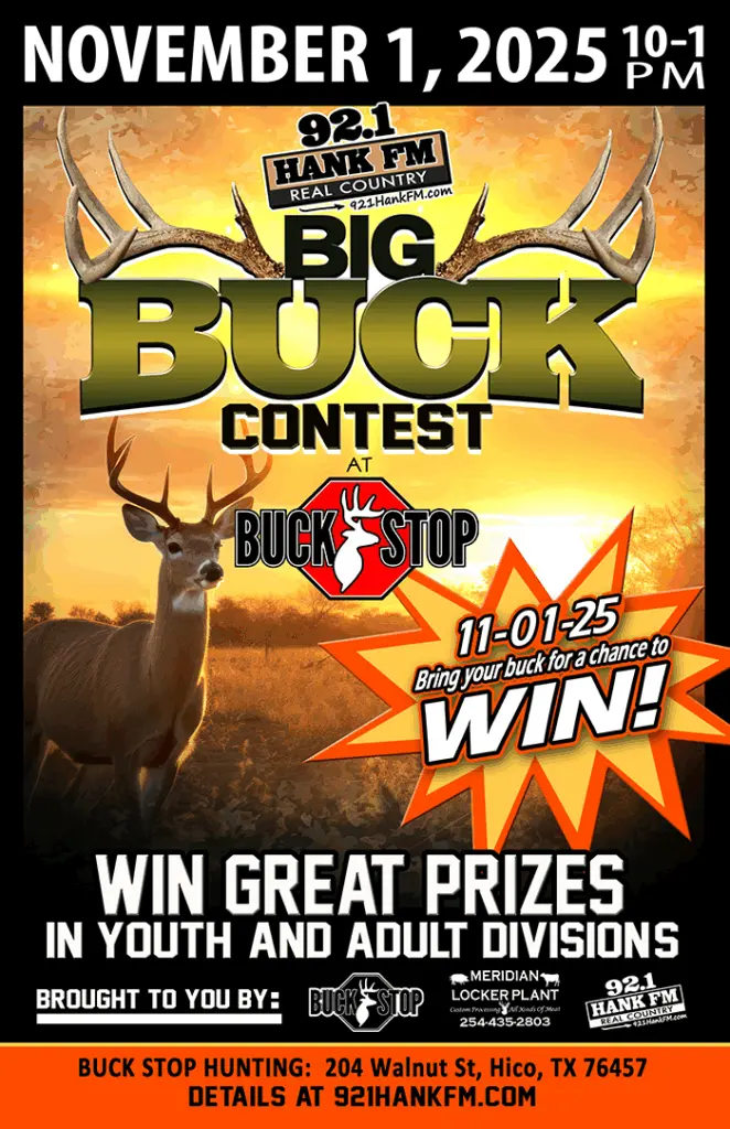 92.1 Hank FM (hereafter referred to as “the Station”) and Buck Stop Hunting will host the Big Buck Contest on Saturday, November 1, 2025, from 10:00 a.m. to 1:00 p.m. at Buck Stop Hunting, 204 Walnut Street, Hico, TX 76457.