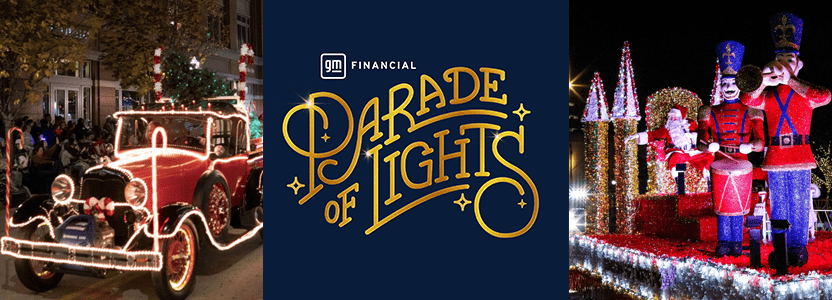 The 2025 GM Financial Parade of Lights starts at 6:00 PM on Sunday, November 23, at the intersection of Weatherford and Throckmorton Streets. The parade will proceed east along Weatherford Street, turn south on Commerce to 9th Street. At 9th Street, the parade turns west, then past the Convention Center to Houston St., and north on Houston Street to 2nd St. The final turns for the parade are west on 2nd St. to Throckmorton Street, and south to 3rd St., where the parade ends.