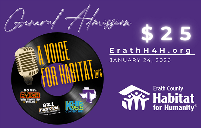 Join Erin Wilde from 92.1 Hank FM and KHITS 95.5, Mark Phillips from 92.1 Hank FM and Shayne Hollinger from 95.9 The Ranch on Saturday January 24th for A Voice For Habitat 2026! A home changes everything… at Erath County Habitat for Humanity, we build community, hope, and homes.