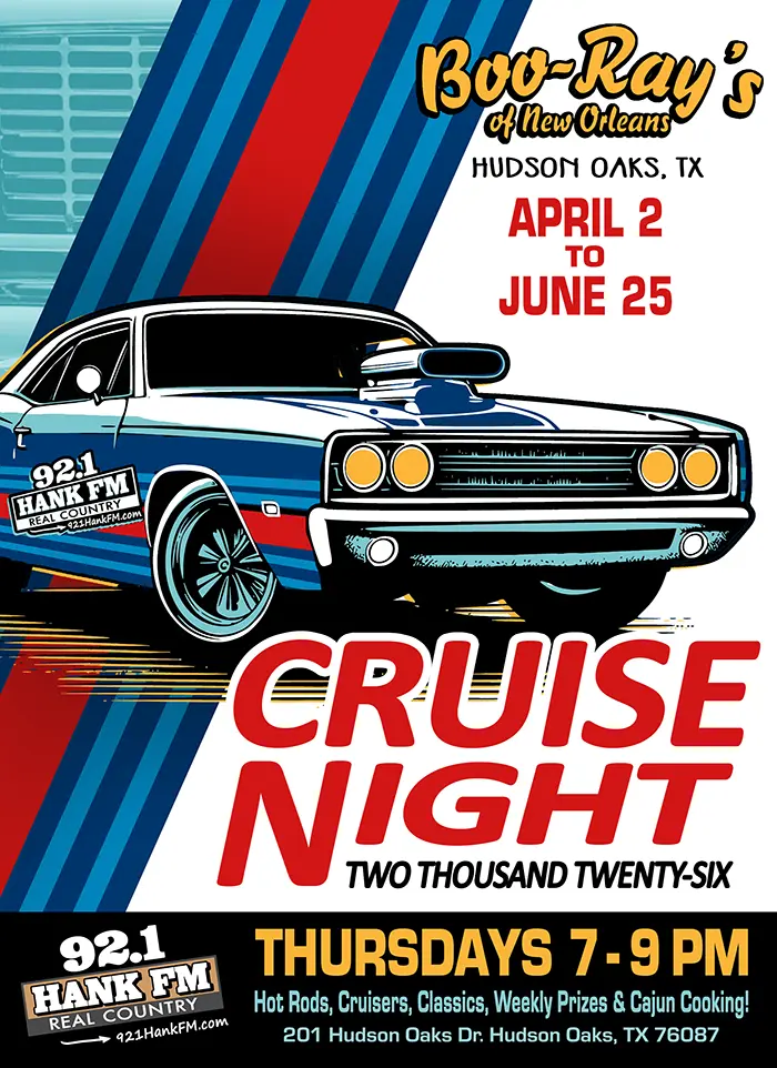 While you’re there, treat yourself to Boo-Rays’ famous cajun food and a cold drink while you take in the sights and sounds of Cruise Night. It’s a family-friendly event, so feel free to bring the kids and make it a weekly tradition. Mark your calendars for Thursday nights and pull into 92.1 Hank FM’s Cruise Night, where the spring nights are warm, the cars are cool, the food is hot and the memories are classic.