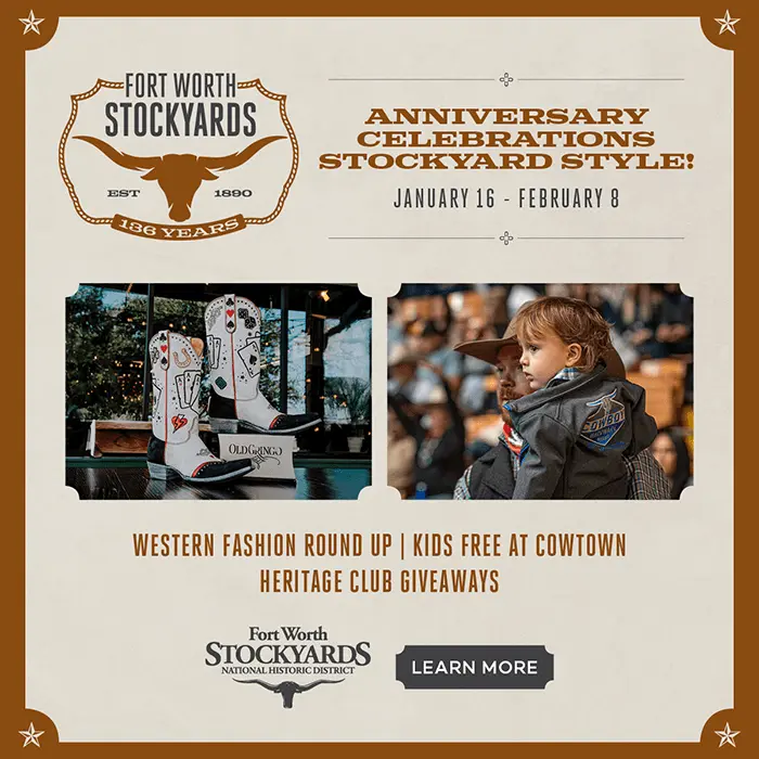 Saddle up with 95.9 The Ranch as we celebrate the 136 years of the LEGENDARY Fort Worth Stockyards! Mosey out January 16th through February 8th for a Western Fashion Round Up featuring trunk shows, happy hours and exclusive sales from over 30 Stockyards retailers. Enjoy exclusive giveaways when you download the Fort Worth Stockyards App. To help celebrate, kids 12 & under get in FREE at Cowtown Coliseum with every paid adult ticket! Stay tuned to 95.9 The Ranch for more exciting news from the Fort Worth Stockyards.