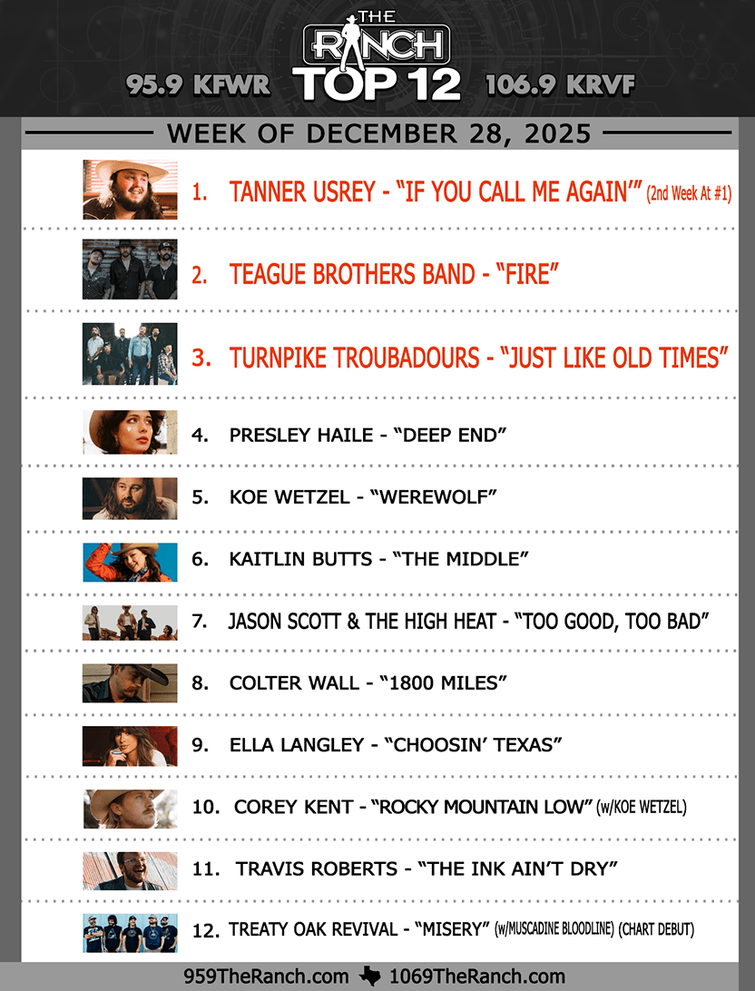 RANCH TOP 12 CHART JULY 09, 2023  TURNPIKE TROUBADOURS – MEAN OLD SUN  TANNER USREY – GIVE IT SOME TIME MIKE & THE MOONPIES – RAINY DAY RACE RICKETTS – YOU DON’T DESERVE WRITING A SONG ABOUT (FEAT. PRESLEY HAILE) DAVID ADAM BYRNES – DRINKIN’ GAMES RANDY ROGERS BAND – KNOW THAT BY NOW CODY CANADA & THE DEPARTED – AGAIN (FEAT. RANDY ROGERS) JASON ISBELL – WHEN WE WERE CLOSE JOSH ABBOTT BAND – COUNTRY NIGHTS BRENT COBB – SOUTHERN STAR PRESLEY HAILE – MOUNTAIN DAUGHTER .WILLIAM BECKMANN – TENNESSEE DRINKING